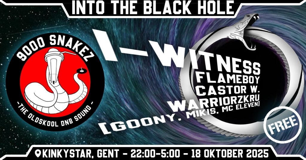 Location: Gent โ€“ Style: Old School DnB โ€“ Entrance: Free โ€“ Time: 22.00-05.00 โ€“ Line up: I-Witness, Flameboy, Castor W., Warriorzkru (Goony, Mikis & MC Eleven)