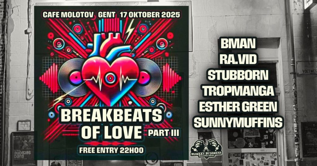 Location: Gent โ€“ Style: Breaks, Jungle, Bass โ€“ Entrance: Free โ€“ Time: 22.00-05.00??? โ€“ Line up: Bman, Ra.Vid, Stubborn, Tropmanga, Esther Green, Sunnymuffins