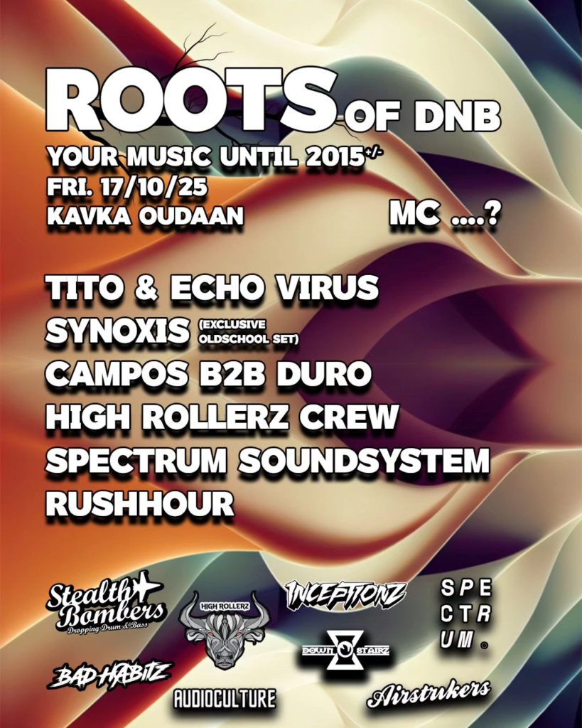 Location: Antwerp โ€“ Style: pre-2015 DnB โ€“ Entrance: ??? โ€“ Time: 23.00-05.00 โ€“ Line up: Tito & Echo Virus, Synoxis, Campos B2B Duro, High Rollerz crew (Carnivore & Cloudgrinder), Rushhour, Spectrum Soundsystem (Yo:Su & Swerve), ???