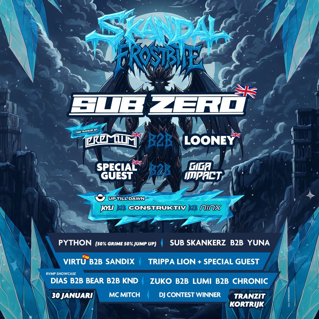 Location: Kortrijk โ Style: Jump Up โ Entrance: 15โฌ to 23โฌ – Time: 21.00-06.00 โ Line up: Sub Zero, Looney B2B Premium, Giga Impact B2B Special Guest, Up Till Dawn showcase (Kyli B2B Construktiv B2B Ninx), Python, Sub Skankerz B2B Yuna, Virtu B2B Sandix, Trippa Lion