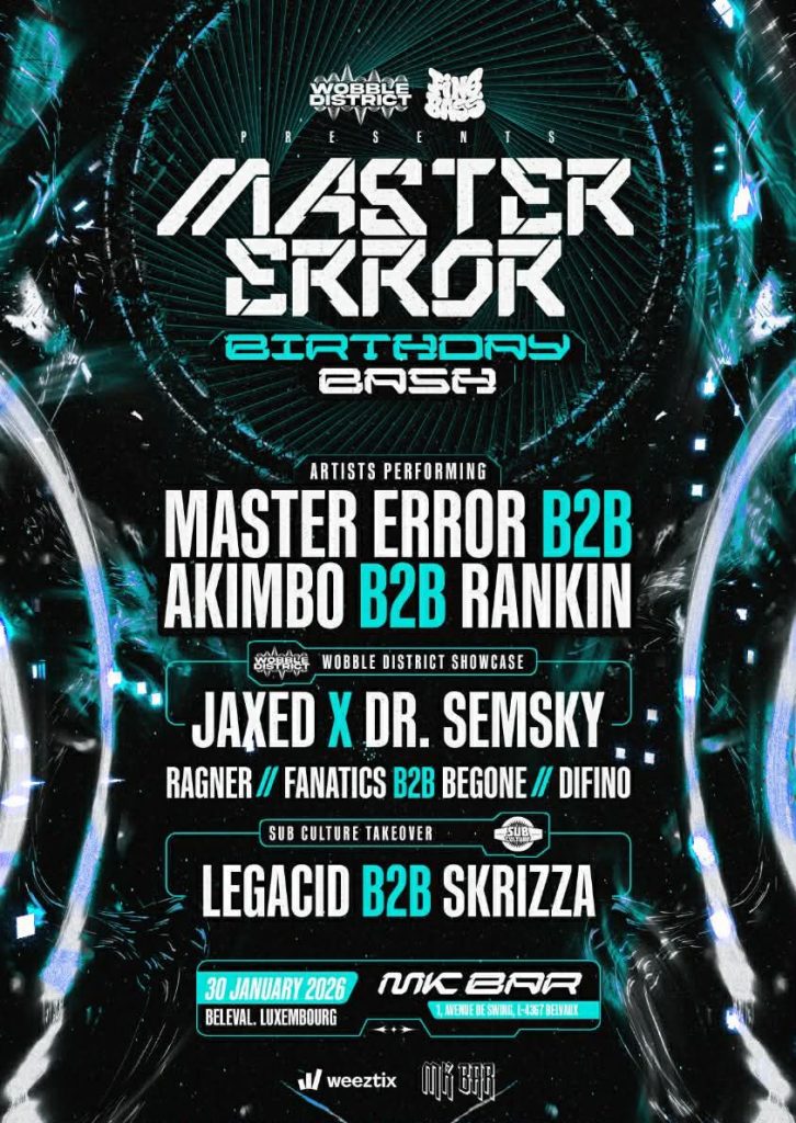 Location: Luxembourg (LU) โ Style: Deep DnB, Neurofunk โ Entrance: 10โฌ to 15โฌ – Time: 23.30-06.00 โ Line up: Thorium, Phtysik B2B Doxy, Stunboy B2B Selek, Borowski, Legacid, Maidik Haze