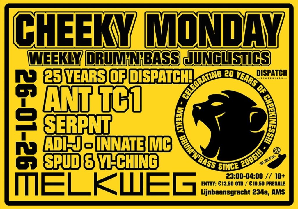 Location: Amsterdam (NL) โ Style: Deep DnB & more โ Entrance: 11โฌ to 14โฌ – Time: 23.00-04.00 โ Line up: Ant TC1, Serpnt, Adi-J, Spud & Yi-Ching, Innate MC