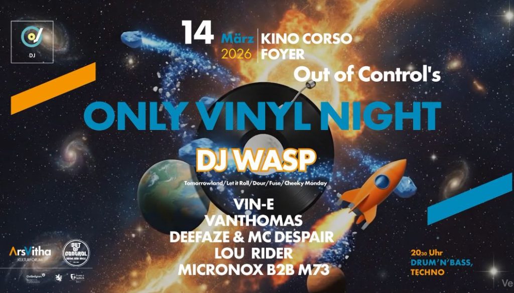 Location: Sankt Vith โ Style: DnB, Techno, Acid โ Entrance: 7โฌ – Time: 20.00-??? โ Line up: DJ Wasp, Dee Faze & MC Despair, Micronox B2B M73, Vin-E, VanThomas, Lou Rider, VJ Fiebertraum