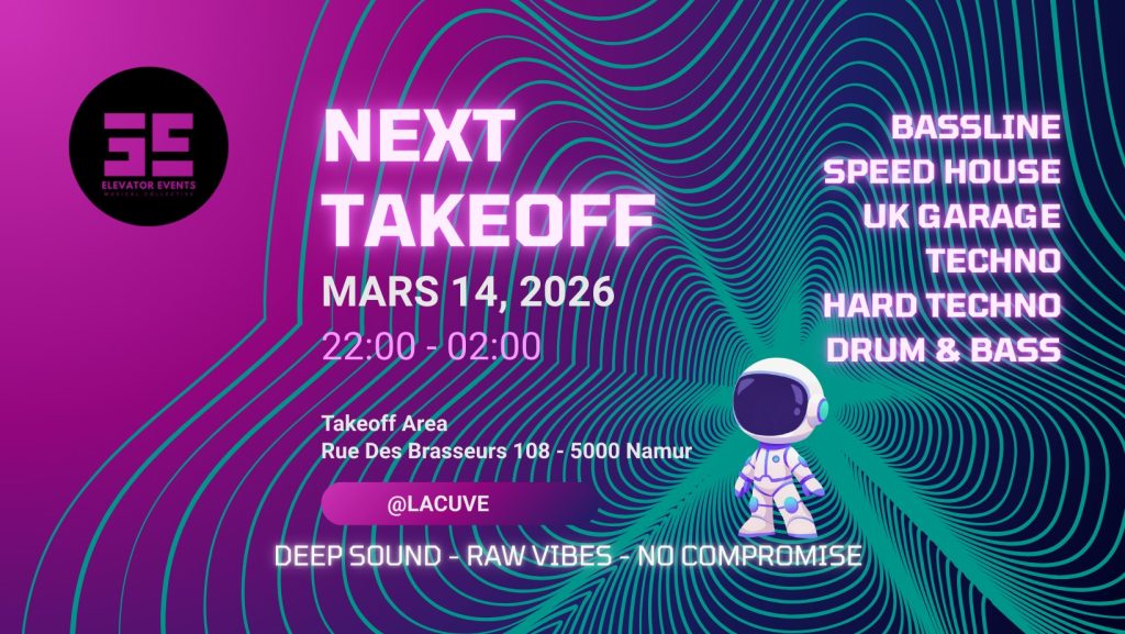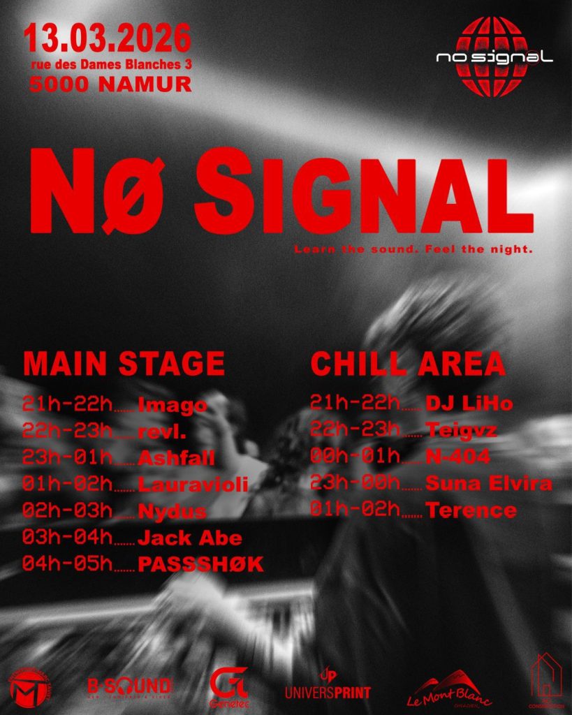 Location: Namur โ Style: Varied Electronic Music โ Entrance: 12โฌ to 15โฌ – Time: 21.00-05.00 โ Line up: Lauravioli, Nydus, Ashfall, Jack Abe, Passhok, Sunaelvira, Terence, N-404, Teigvz, LiHo, Imago, revl.