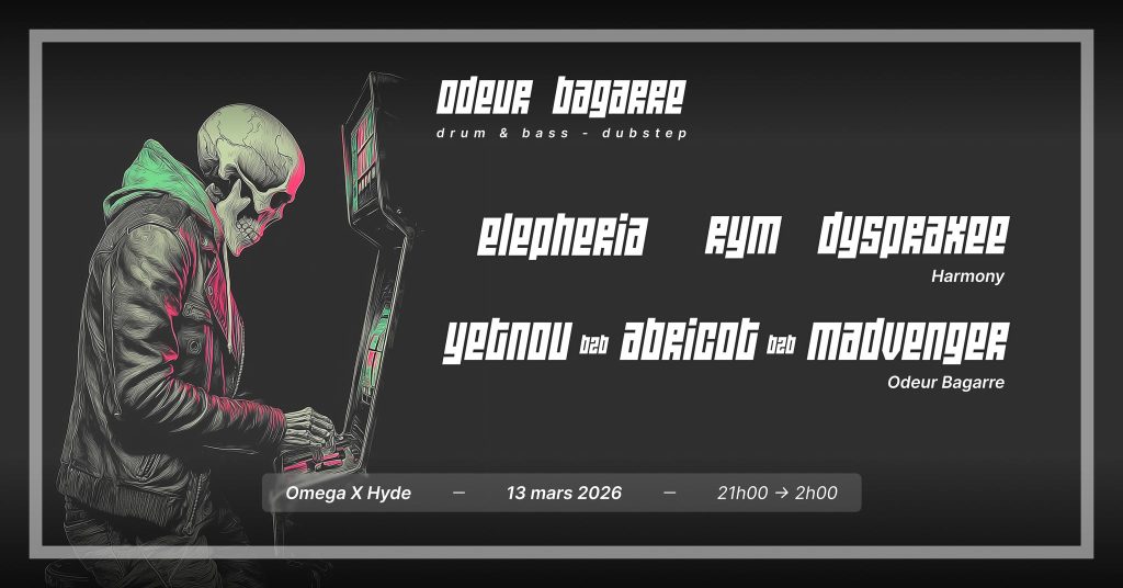 Location: Lille (FR) โ Style: DnB, Dubstep โ Entrance: Free โ Time: 21.00-02.00 โ Line up: Elepheria, Rym, Dyspraxee, Yetnou B2B Abricot B2B Madvenger
