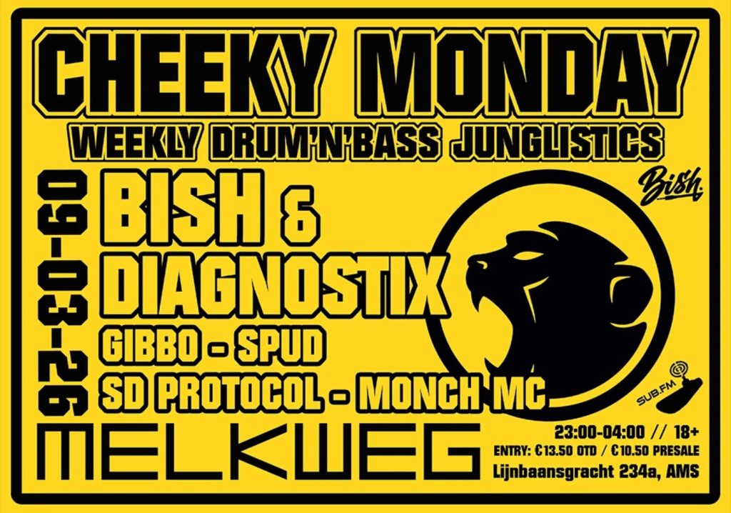 Location: Amsterdam (NL) โ Style: Jungly DnB & more โ Entrance: 11โฌ to 14โฌ – Time: 23.00-04.00 โ Line up: Bish & Diagnostix, Gibbo, SD Protocol, Spud, Monch MC
