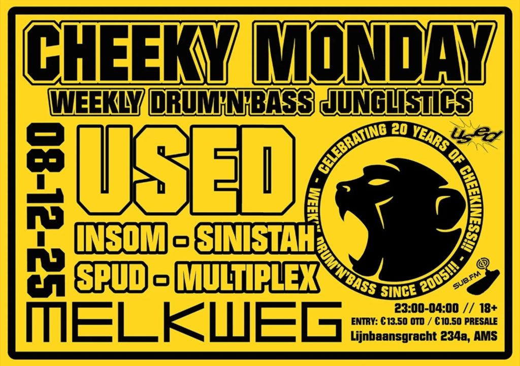 Location: Amsterdam (NL) โ Style: Dancefloor & more โ Entrance: 11โฌ to 14โฌ – Time: 23.00-04.00 โ Line up: Used, Insom, Sinistah, Spud, Multiplex