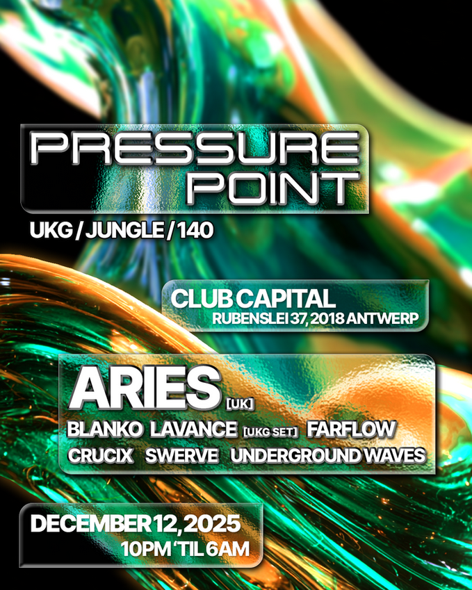 Location: Antwerp โ Style: UK Garage, Jungle, 140 โ Entrance: 11โฌ to 16โฌ – Time: 22.00-06.00 โ Line up: Aries, Blanko, Lavance, Farflow, Crucix, Swerve, Underground Waves