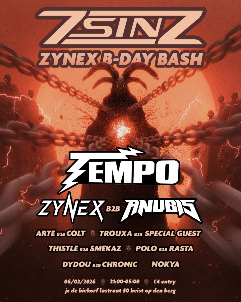 Location: Heist-Op-Den-Berg – Style: Jump Up – Entrance: 4€ – Time: 21.00-05.00 – Line up: Tempo, Zynex B2B Anubis, Arte B2B Colt – Trouxa B2B Special Guest, Thistle B2B Smekaz, Polo B2B Rasta, Dydou B2B Chronic, Nokya