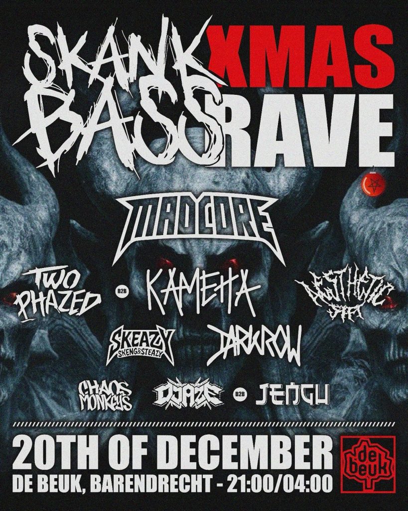 Location: Rotterdam (NL) โ Style: Dubstep, Riddim, DnB โ Entrance: 7โฌ – Time: 21.00-04.00 โ Line up: Madcore, Two Phazed B2B Kameha, Aesthetic Sift, Skeazy (Skeng & Steazy), Darkrow, Chaos Monkeys, Djaze B2B Jengu