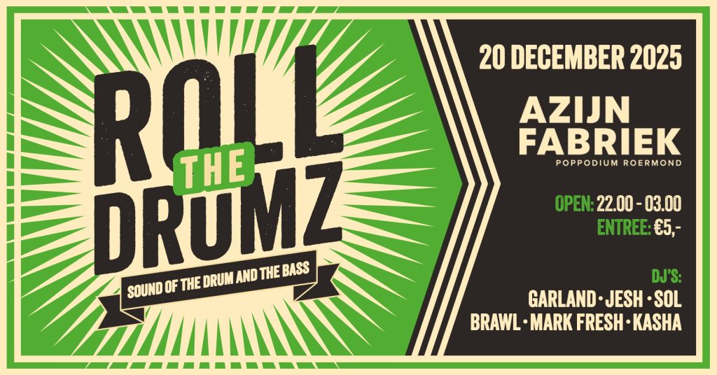Location: Roermond (NL) โ Style: Breakbeat, Jungle, DnB โ Entrance: 5โฌ – Time: 22.00-03.00 โ Line up: Garland, Jesh, Sol, Brawl, Mark Fresh, Kasha