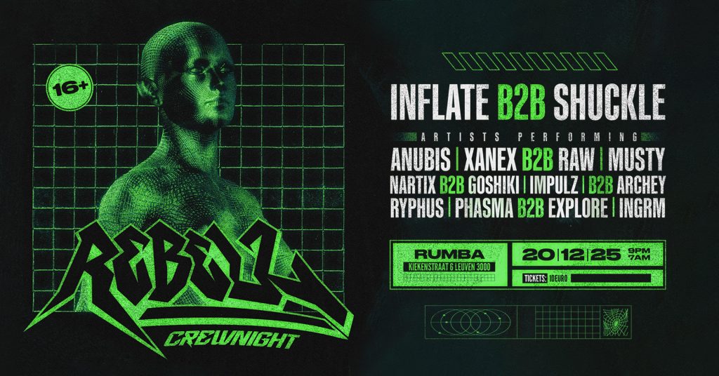 Location: Leuven โ Style: Jump Up โ Entrance: 11โฌ – Time: 21.00-07.00 โ Line up: Inflate B2B Shuckle, Anubis, Xanex B2B Raw, Musty, Nartix B2B Goshiki, Impulz B2B Archey, Ryphus, Phasma B2B Explore, Ingrm