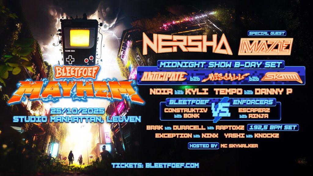 Location: Antwerp โ€“ Style: Jump up โ€“ Entrance: 14โ‚ฌ to 18โ‚ฌ – Time: 21.00-05.00 โ€“ Line up: Onara, Skamm B2B Miscall, Gunsoo B2B Xscar, Woibo B2B Finningham, Brak B2B Rascal, Rinja B2B Mallo B2B Krknt, Nessix B2B Instant, Nukombi B2B Sidubz, DJ Contest