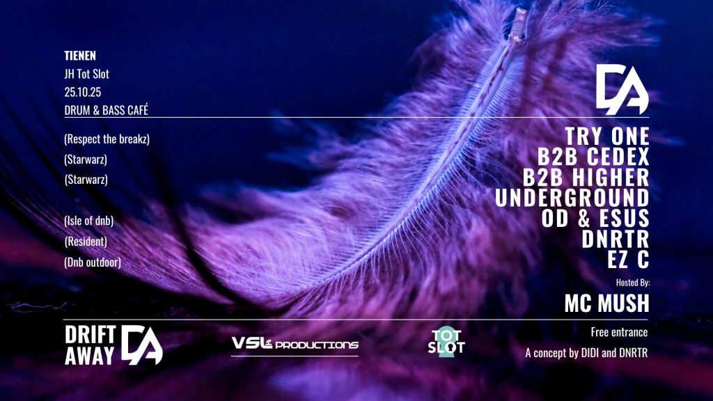 Location: Tienen โ€“ Style: Deep DnB, Liquid Funk & more โ€“ Entrance: Free โ€“ Time: 20.00-02.00 โ€“ Line up: Try One B2B Cedex B2B Higher Underground, OD & Esus, Dnrtr, EZ C, MC Mush