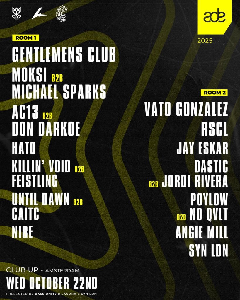 Location: Amsterdam (NL) โ€“ Style: Dubstep, Jump Up, Dancefloor DnB, Basshouse, Bassline, Trap โ€“ Entrance: 16โ‚ฌ to 21โ‚ฌ – Time: 22.00-05.00 โ€“ Line up: Gentlemens Club, Moksi B2B Michael Sparks, AC13 B2B Don Darkoe, Hato, Killin’ Void B2B Feistling, Until Dawn B2B CaitC, Nire, Vato Gonzalez, RSCL, Jay Eskar, Dastic B2B Jordi Rivera, Poylow B2B No Qvlt, Angie Mill, Syn LDN