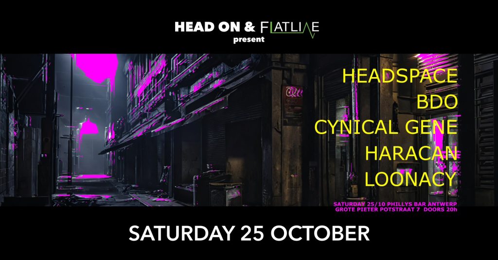 Location: Antwerp โ€“ Style: Deep DnB & more โ€“ Entrance: Free โ€“ Time: 20.00-02.00 โ€“ Line up: Headspace, BDO, Cynical Gene, Haracan, Loonacy